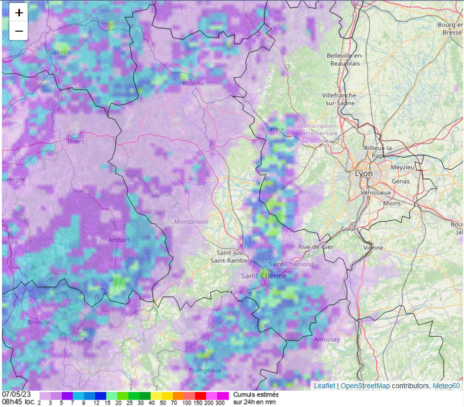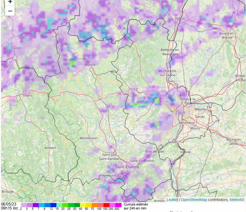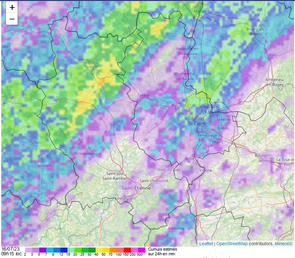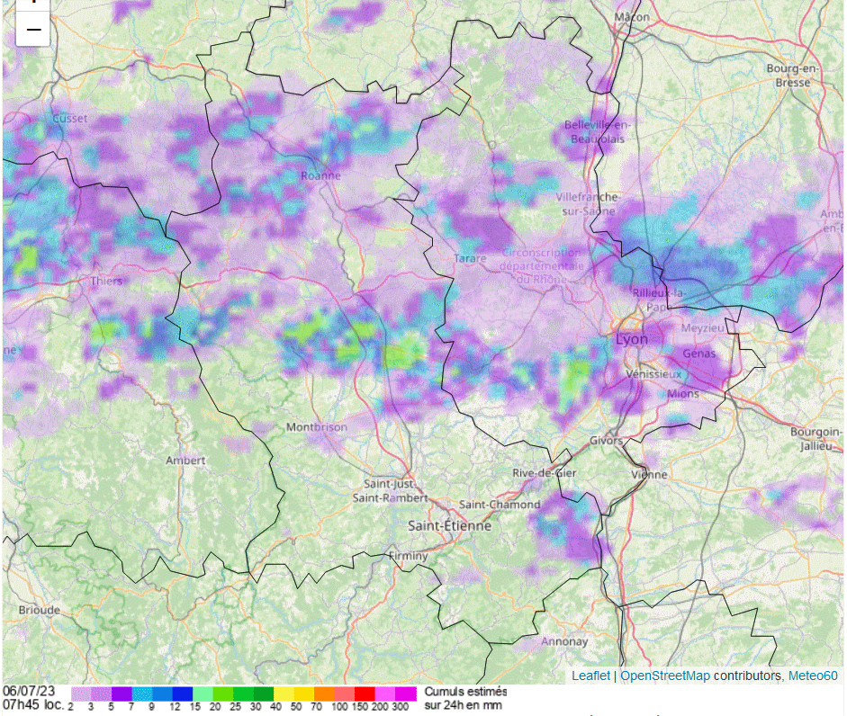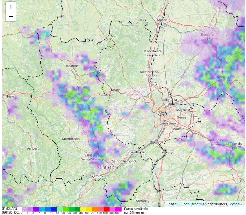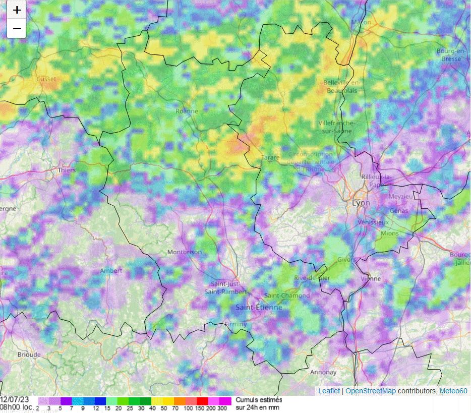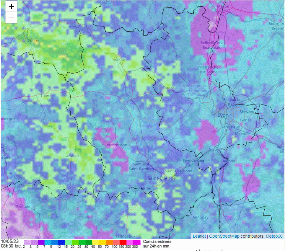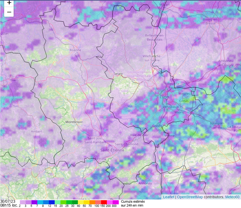 L'épisode pluvieux ne s'est pas moqué de nous sur ce coup là, si on totalise ses millimètres de mercredi 8h à ce matin 8 h on arrivé à : 30.6 mm à Savigneux, 32.4 à Boën, 35.6 à St-Georges-en-Couzan, 36.6 à Andrézieux, 37.6 à St-Just-en-Chevalet, 39.2 à St-Etienne, 39.4 à Roanne, 40.4 à St-Maurice-sur-Loire, 42.0 à Feurs, 42.4 à Grammond, 43.4 à Bard, 44.5 à St-Chamond, 45.0 à St-Symphorien-sur-coise, 45.2 à Balbigny et Châtelneuf, 46.8 à Sain-Bel, 47.8 à St-Vérand, 48.4 à Fourneaux, 48.6 à Panissières, 49.8 à St-Genis-l'Argentière, 50.4 à St-Bonnet-le-Château, 51 à Montmelas, 51.5 à Ancy, 52.4 à Montagny, 52.5 au col de la Loge, 53.1 à Nandax, 54.6 à Chazelles, 54.7 à Cours, 55.7 à Liergues, 55.9 à St-Didier-sur-Beaujeu, 57.3 à Tarentaise, 57.6 à St-Georges-de-Reneins, 58.4 à Chalmazel, 58.8 à Anse, 59.6 à Mornant, 60.1 à Monsols, 61.3 aux Sauvages, 61.9 au parc de la Tête d'Or, 62.1 à Villefranche, 62.7 à Satolas, 63.1 à Vauxrenard, 69.7 à Brindas, 71.8 à Tarare, 72 ici à Violay, 72.5 à Bron, 73.6 à St-Genis-Laval, 75.6 à Mions, 76.7 à Graix, 78.3 à St-Sauveur-en-Rue, 87.2 à Corbas, 89.8 à Trèves.