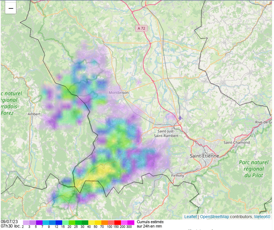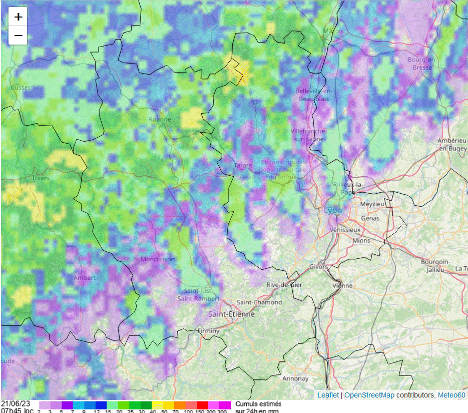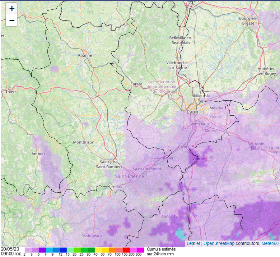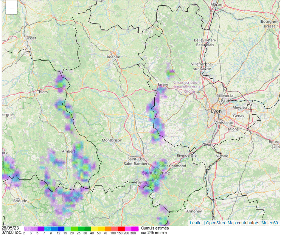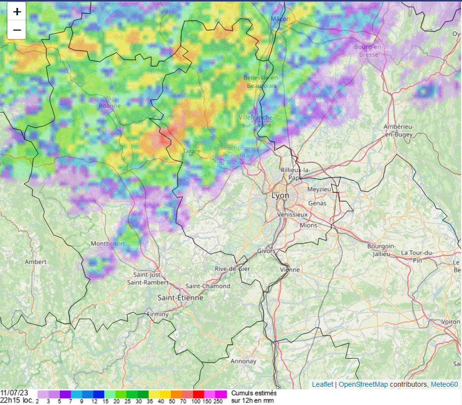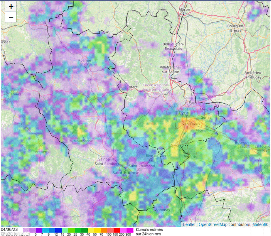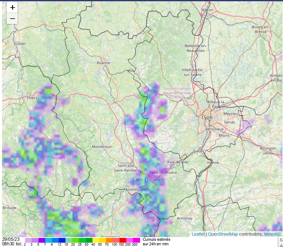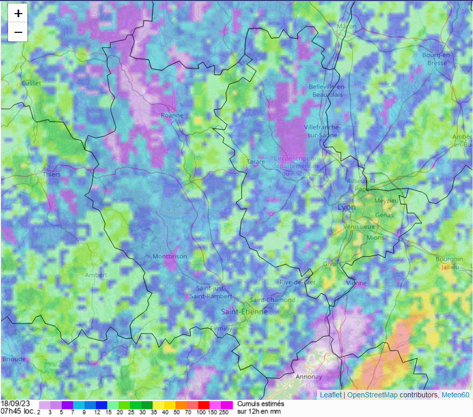 L'épisode pluvieux ne s'est pas moqué de nous sur ce coup là, si on totalise ses millimètres de mercredi 8h à ce matin 8 h on arrivé à : 30.6 mm à Savigneux, 32.4 à Boën, 35.6 à St-Georges-en-Couzan, 36.6 à Andrézieux, 37.6 à St-Just-en-Chevalet, 39.2 à St-Etienne, 39.4 à Roanne, 40.4 à St-Maurice-sur-Loire, 42.0 à Feurs, 42.4 à Grammond, 43.4 à Bard, 44.5 à St-Chamond, 45.0 à St-Symphorien-sur-coise, 45.2 à Balbigny et Châtelneuf, 46.8 à Sain-Bel, 47.8 à St-Vérand, 48.4 à Fourneaux, 48.6 à Panissières, 49.8 à St-Genis-l'Argentière, 50.4 à St-Bonnet-le-Château, 51 à Montmelas, 51.5 à Ancy, 52.4 à Montagny, 52.5 au col de la Loge, 53.1 à Nandax, 54.6 à Chazelles, 54.7 à Cours, 55.7 à Liergues, 55.9 à St-Didier-sur-Beaujeu, 57.3 à Tarentaise, 57.6 à St-Georges-de-Reneins, 58.4 à Chalmazel, 58.8 à Anse, 59.6 à Mornant, 60.1 à Monsols, 61.3 aux Sauvages, 61.9 au parc de la Tête d'Or, 62.1 à Villefranche, 62.7 à Satolas, 63.1 à Vauxrenard, 69.7 à Brindas, 71.8 à Tarare, 72 ici à Violay, 72.5 à Bron, 73.6 à St-Genis-Laval, 75.6 à Mions, 76.7 à Graix, 78.3 à St-Sauveur-en-Rue, 87.2 à Corbas, 89.8 à Trèves.