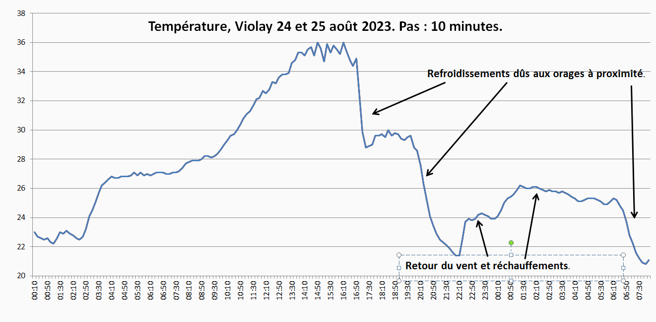 Le refroidissement d'hier nous a donc ramené à des températures plus conformes à la saison. Hier à 17h il ne faisait que 12.3° ici à Violay, il faut remonter au 16 mai dernier pour rencontrer une température plus froide (mais alors bien plus froide puisqu'il ne faisait alors que 6.9°) à cette heure de la journée.